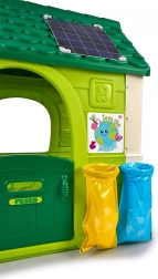 Domeček zahrnuje dva recyklační koše v modré a žluté barvě, které učí děti o důležitosti odpadu a jeho správném třídění.
