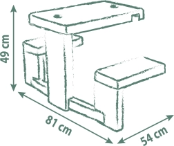Součástí jsou dvě pevné lavice spojené se stolem. Děti mají stabilní a pohodlné místo pro kreslení, hry i svačinu.