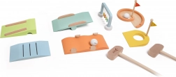 Součástí setu jsou 2 golfové hole, 2 míčky, 2 jamky s vlaječkami a 5 originálních překážek, se kterými si děti vytvářejí vlastní tratě. Hra podporuje spolupráci, trpělivost a pohybovou aktivitu.