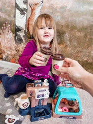 Set dětské kavárny WOOPIE nabízí autentický zážitek z přípravy kávy – stačí nalít vodu do zásobníku, nasadit páku, přiložit kelímek a „káva“ je hotová. Při mletí a spařování zní realistické zvuky, bliká červené světlo, a po dokončení se rozsvítí zelená kontrolka se zvukovým signálem. Vitrína s donuty, croissanty a dalšími dobrotami doplňuje atmosféru malé pekárny.