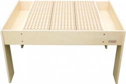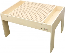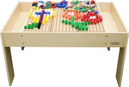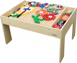Stůl má stabilní dřevěnou konstrukci a praktické boční přihrádky pro přehledné ukládání dílků. Díky velké pracovní ploše se u něj pohodlně vystřídá i více dětí najednou – ideální do dětského pokoje, koutku či herny.