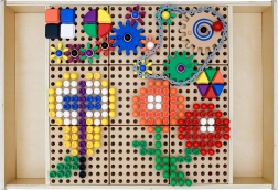 Robustní perforovaná deska nabízí spoustu prostoru pro tvoření vzorů i staveb. Otvory jsou připravené pro kolíčky i šroubky, takže děti snadno kombinují tvary, barvy a konstrukční nápady.