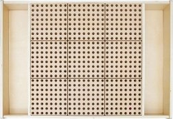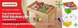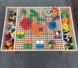 Dřevěný vzdělávací stůl Masterkidz pro kreativní učení STEM nabízí panel 63 × 63 cm, do kterého děti vkládají barevné kolíčky, šroubky a ozubená kola. Vznikají tak originální vzory i funkční mechanismy, které rozvíjejí jemnou motoriku, koordinaci oko–ruka a logické myšlení. Dva boční košíky udrží doplňky po ruce a u stolu si pohodlně vyhrají i dvě a více dětí.