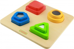 Tento dřevěný Montessori sorter kombinuje několik vzdělávacích aktivit v jedné hře. Dítě nejprve vkládá barevné geometrické tvary do správných otvorů v desce a následně je páruje podle tvaru, barvy i textury. Díky tomu přirozeně trénuje logické myšlení, koordinaci oko–ruka a hmatové vnímání.