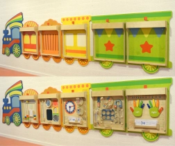 Atraktivní vlakový motiv promění stěnu v interaktivní zónu. Děti láká k objevování a podporuje rozvoj jemné motoriky i kognitivních dovedností.