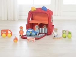 Po rozložení vznikne kompletní scéna záchranných složek – policie, hasiči a zdravotníci. Součástí jsou dřevěné postavičky, vozidla a doplňky, které zvou k otevřené hře a role-play. Po dohrání se vše snadno vrátí na své místo a batoh se zapne na zip.