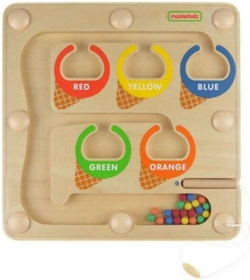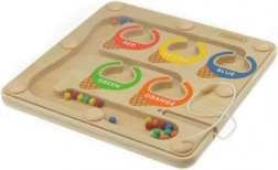 Uzavřená konstrukce s průhledným krytem je bezpečná a odolná, kuličky zůstávají uvnitř a nic se neztrácí. Děti trénují jemnou motoriku, koordinační schopnosti, trpělivost i koncentraci při přemisťování kuliček po dráhách v barvách červená, žlutá, modrá, zelená a oranžová.