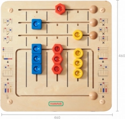 Tato kvalitní vzdělávací tabule MASTERKIDZ je rozdělena na dvě části: horní lišta s úkoly, kde děti přiřazují tři tvary (červený šestiúhelník, modrý čtverec, žluté kolečko), a spodní část se třemi sloupci s 9 tvary k třídění. Díky barevným úchytům si děti zároveň procvičují znalost barev. Všechny dílky jsou integrovány do tabule – snadno se posouvají, ale nepadají a neztrácejí se.