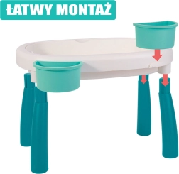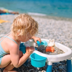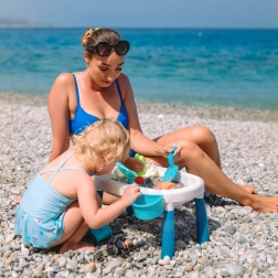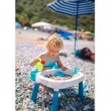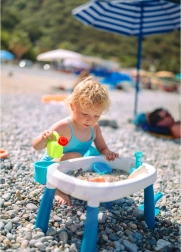 Dvě oddělené části umožní kombinovat vodní experimenty a pískové stavby v jednom kompaktním stolku – ideální pro celoroční zábavu.