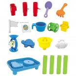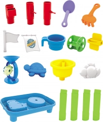Obsahuje všechny potřebné nástroje pro kreativní hru s pískem a vodou - formičky, hrabičky, lopatky a další.