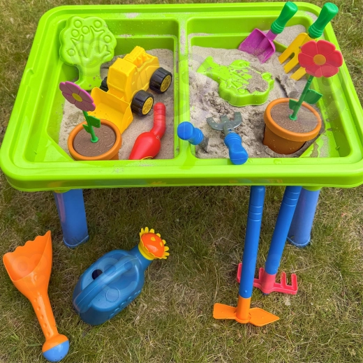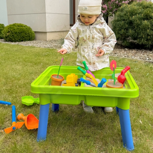 Bohatá výbava 13 doplňků (konev, lopatky, hrábě, formičky, malý autíčko–sklápěč, květináč s kvítkem a další) podněcuje představivost, rozvíjí jemnou motoriku a podporuje samostatnou i společnou hru. Ideální na zahradu, terasu, pláž i do dětského pokoje.