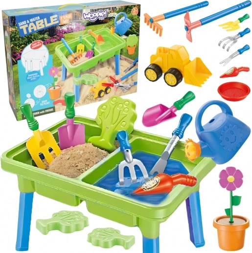 Dětský hrací stolek 2v1 od značky WOOPIE kombinuje vodní a pískovou zábavu v jednom. Disponuje dvěma vaničkami pro vodu a písek, obsahuje 13 barevných doplňků a podporuje kreativní i smyslovou hru venku i doma. Lehká konstrukce, snadné sestavení a hodiny zábavy pro děti od 3 let.