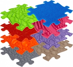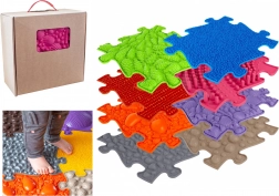 Senzorická ortopedická podložka složená jako puzzle má povrchy s různými tvrdostmi a strukturami, které se dokonale doplňují. Tvrdé prvky, jako jsou kužele a mušle, stimulují a posilují klenbu nohy, zatímco větší kameny pomáhají zatížit svaly nohy a trénovat vnímání různých povrchů. Měkké povrchy jako tráva a oceánské vlny slouží jako příprava nebo uvolnění.