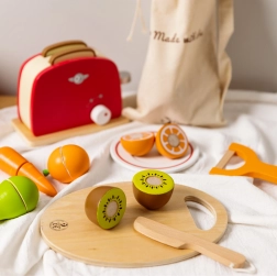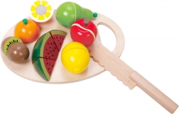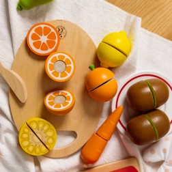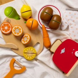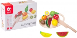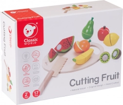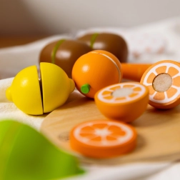 Dřevěný set krájecích ovoce od Classic World je vynikající hračkou pro malé kuchaře. Obsahuje 17 dílků, které děti naučí krájet ovoce na speciální dřevěné desce. Jednotlivé části ovoce jsou spojeny pomocí suchého zipu, díky čemuž děti při krájení cítí oporu jako u opravdového krájení. Po nakrájení lze ovoce snadno složit zpět a hra může začít znovu.