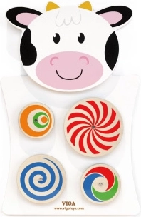 Dřevěná manipulační tabule ve tvaru kravičky od značky VIGA přináší dětem zábavnou formu učení. Otočné kotouče se vzory trénují jemnou motoriku, logické myšlení a vizuální vnímání. Povrch je ošetřen bezpečnými, netoxickými barvami v živých odstínech a dřevo pochází z FSC certifikovaných zdrojů.