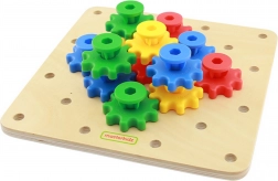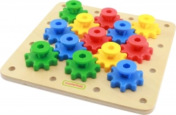 Dřevěná deska má otvory, do kterých lze vložit kolíčky držící ozubená kola. Tato kola lze umístit v řadách tak, aby se vzájemně uváděla do pohybu. Zábava je velmi kreativní a děti to bude bavit celé hodiny.