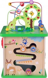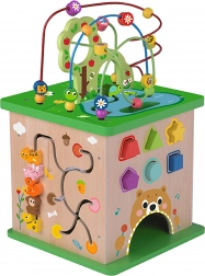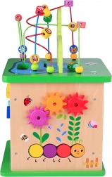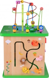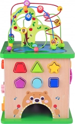 - 5 aktivit v 1 hračce: motorický labyrint, tvarový sorter, ozubená kolečka, otáčecí prvky, posuvný labyrint se zvířátky