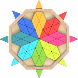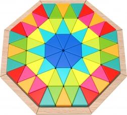 Dřevěná mozaika TOOKY TOY nabízí neomezené možnosti skládání vzorů z pestrých trojúhelníků. Díly lze ukládat do osmiúhelníkového rámu nebo tvořit na jakékoli rovné ploše. Děti si při hře procvičí rozpoznávání barev a tvarů, logické myšlení i koordinační dovednosti.