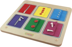 Tato kvalitní dřevěná vzdělávací tabule přináší dětem bezpečný prostor pro nácvik skutečných zapínacích mechanismů. Každá z 6 horizontálních kapes představuje jiný typ zapínání známý z bund, mikin či košil, takže se děti učí dovednostem, které uplatní každý den.