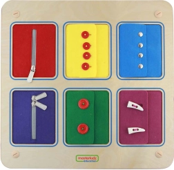 Rozvíjejte dětskou šikovnost s dřevěnou montessori tabulí MASTERKIDZ. Šest barevných textilních kapes simuluje zapínání oblečení a učí děti praktickým dovednostem: zipy, knoflíky, patenty i dvojitý zip. Odolné dřevěné provedení a smysluplná hra podporují jemnou motoriku, koordinaci oko–ruka a samostatnost.
