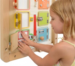Tato robustní dřevěná tabule nabízí 6 různých dvířek a zámkových mechanismů – od jednoduchých západek po složitější háčky a petlice. Děti si hravou formou procvičí trpělivost, zručnost prstů a řešení problémů. Každé otevření dvířek přináší odměnu v podobě prostoru pro skrytí drobností nebo kartiček.