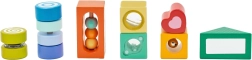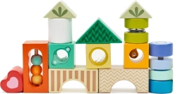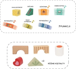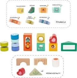 Tento kvalitní set obsahuje rozmanité tvary a prvky pro smyslové vnímání – průhledy, zvukové a pohyblivé detaily – které děti přirozeně vedou k pozorování, třídění a objevování. Hra s kostkami rozvíjí logické myšlení, řešení problémů i koordinaci ruka–oko.