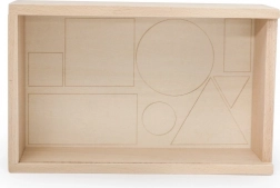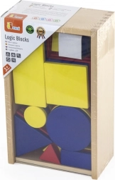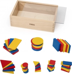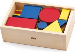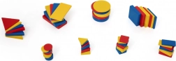 Bohatá sada geometrických tvarů v červené, žluté a modré barvě motivuje děti ke skládání vzorů, třídění a rozpoznávání tvarů i barev.