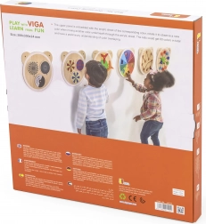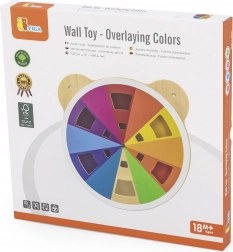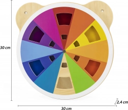 Dřevěná tabulka s mícháním barev ve tvaru medvědí hlavy je nejen esteticky přitažlivá, ale také vzdělávací pomůcka pro děti od 18 měsíců. Díky otáčení akrylového disku mohou děti mixovat barvy a objevovat nové. Každá rotace vyústí v jedinečné barvy, které děti fascinují.