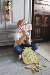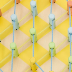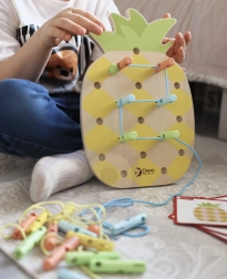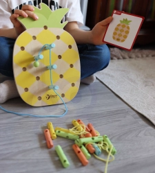 Tato hračka pomáhá dětem rozvíjet jemnou motoriku a koordinaci rukou a očí při navlékání šňůrek skrz kolíčky, zlepšuje kreativitu a představivost.