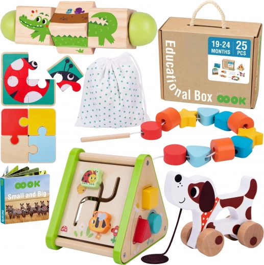 - 6 aktivit v jednom: dřevěné puzzle 4 díly, tahací pejsek na kolečkách, navlékací korálky s dřevěnou jehlou a sáčkem, aktivní trojúhelník (sorter, labyrint, ozubená kola, počítadlo), otáčecí kostky s obrázky, obrázková knížka „Small and Big“.