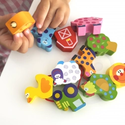 Tato edukativní navlékací hračka podporuje trpělivost, soustředění a vytváření vlastních příběhů ze života na farmě. Díly jsou robustní, příjemné do ruky a ideální pro malé dětské ruce.