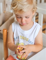Provlékání šňůrky skrz dřevěné dílky učí děti přesným pohybům prstů a zlepšuje koordinaci oko–ruka. Zábava, která přirozeně rozvíjí dovednosti.