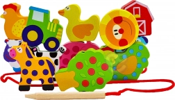 Objevte kouzlo farmy s dřevěnou navlékací sadou WOOPIE GREEN. Děti navlékají barevné prvky – kravičku, traktor, stodolu, koníka, ovečku, plůtek, slepičku, kohouta, balík sena a další – na šňůrku a trénují tak přesnost prstů i koordinaci oko–ruka. Přírodní dřevo a netoxické barvy zajišťují bezpečnou hru, která zároveň respektuje životní prostředí.