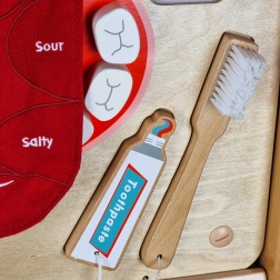 - Pohyblivý jazyk se zónami chutí; potraviny na suchý zip; zubní kartáček, pasta, zubní nit