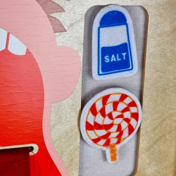 Velký pohyblivý jazyk s jasně označenými chutěmi a potraviny na suchý zip učí děti rozlišovat sladkou, slanou, kyselou a hořkou chuť.
