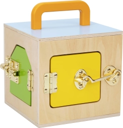 - Zamykací box se 3 různými zámky, 8 dřevěných kamenů, dřevěná tabule počasí, sada pro počítání 1–10, omalovánky Zvířátka Level 1, 6 měkkých pastelek, knížka „Mám 3 roky“, rodičovský průvodce
