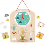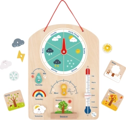 Děti si pomocí otočných ukazatelů zaznamenají aktuální počasí, teplotu i roční období. Skvělý rituál pro ranní i večerní společné povídání a rozvoj slovní zásoby.