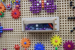 Obsah zásobníku vidíte na první pohled – děti snadno najdou správné kolíky či šroubky a tvorba na STEM tabuli je plynulá a zábavná.