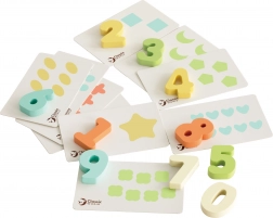 Barevné číslice a tematické kartičky učí děti odlišovat čísla, chápat množství a spojovat symbol s počtem – zábavně a intuitivně.