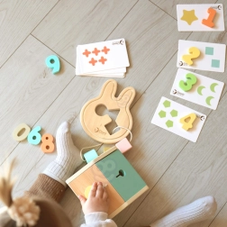 - dřevěný sorter tvarů, číslice s kartičkami, kostky, provlékací hra ve tvaru králíčka
