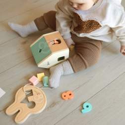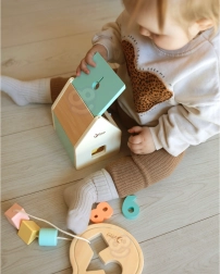 Dřevěný sorter s víkem a výřezy povzbuzuje děti k rozpoznávání tvarů a barev a posiluje koordinaci oko–ruka i prostorovou představivost.