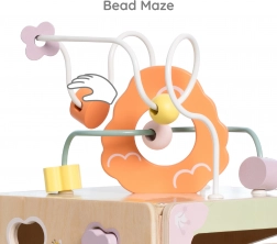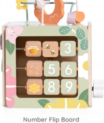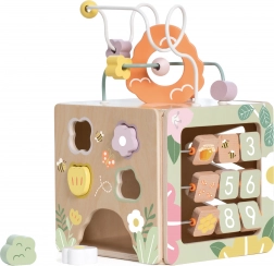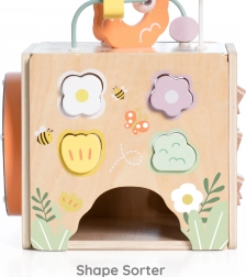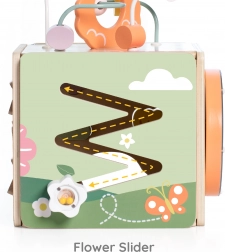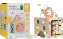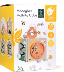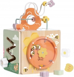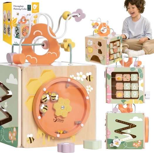 Objevte kouzlo dřevěné kostky, která nabízí pět různých aktivit v jednom. Děti zde najdou rotační kostky s čísly a obrázky, kuličkový labyrint, posuvné lišty, geometrické tvary a otáčecí kolečko s včelami. Každý prvek kostky je navržen tak, aby stimuloval zvídavost a rozvíjel dovednosti dětí.