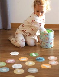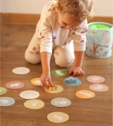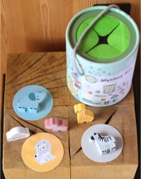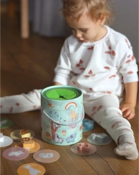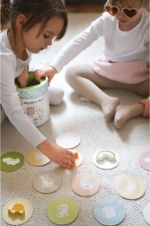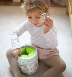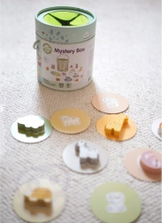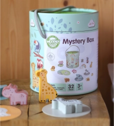 Při hře Tajemná Krabička děti vybírají jednu z 15 karet a pomocí dotyku hádají, která figurka se skrývá v krabičce – přitom se učí rozpoznávat její tvar. Hra rozvíjí smysl pro dotek, jemnou motoriku a soustředění. Sada umožňuje různé kreativní způsoby hraní, jako je párování, učení barev, názvy zvířat a stavění věží.