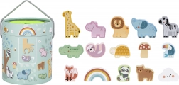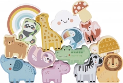 Obsahuje 15 dřevěných figurek zahrnující zvířátka, duhu, mráček a houbičku pro rozmanitou a vzdělávací hru.