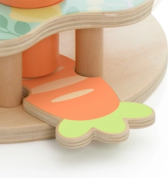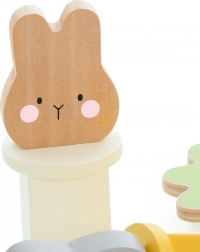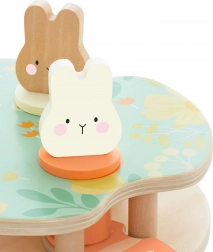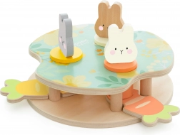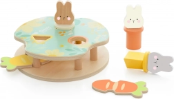 Hračka obsahuje tři barevné králíčky, které dítě vkládá do platforem dle tvaru a barvy. Stisknutí mrkve způsobí jejich vykouknutí!