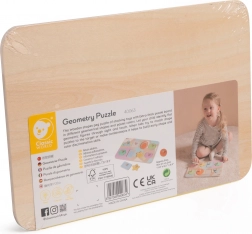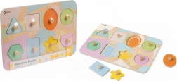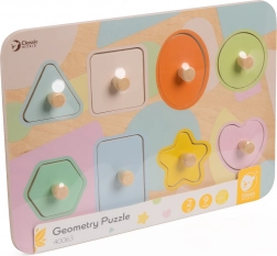 Tato krásná dřevěná skládačka nabízí mnoho možností pro výuku a zábavu. Sada obsahuje devět dílků s různými geometrickými tvary, které jsou malovány v příjemných pastelových barvách. Děti se učí rozpoznávat tvary a barvy tím, že spojují jednotlivé dílky s odpovídajícími otvory na desce.