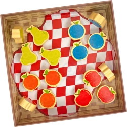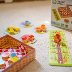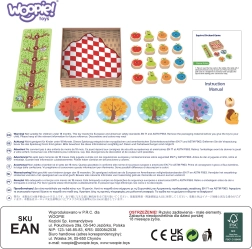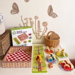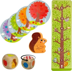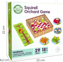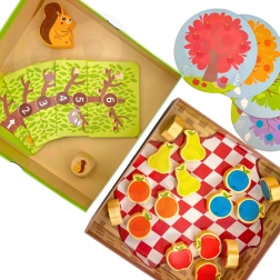 Rodinná hra VEVERKA V SADU od WOOPIE GREEN je ideální první desková hra pro nejmenší. Děti společně hází kostkou, sbírají barevné dřevěné ovoce z stromu a dávají ho do košíku. Když padne veverka, jeden z nasbíraných plodů se vrací zpět – napětí i radost z vítězství jsou zaručeny.