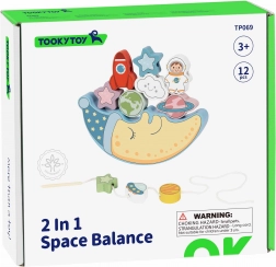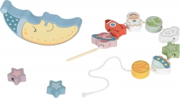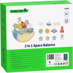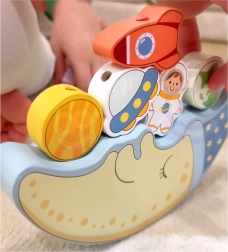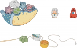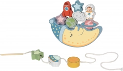 První částí sady je balancující výzva: děti se pokoušejí umístit 10 barevných bloků – raketu, astronauta, hvězdy, UFO, planety a veselý mrak – na spící tvář měsíce, snažíce se, aby konstrukce nespadla. To je skvělá příležitost pro cvičení přesnosti a trpělivosti.