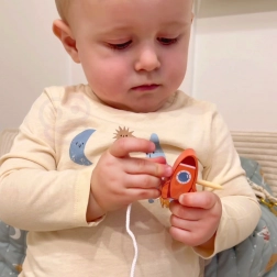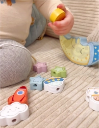 Druhá část nabízí kreativní hru na navlékání: bloky lze navlékat pomocí dřevěné jehly a šňůry, což pomáhá rozvíjet jemné motorické dovednosti a koordinaci rukou a očí.