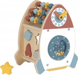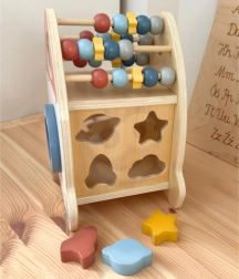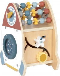 Hračka pomáhá rozvíjet jemnou motoriku díky interaktivním prvkům, jako jsou korálky a tvarové třídění.